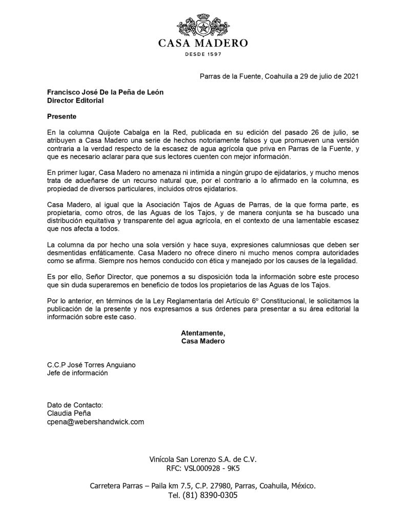 En la columna Quijote Cabalga en la Red, publicada en su edición del pasado 26 de julio, se atribuyen a Casa Madero una serie de hechos notoriamente falsos y que promueven una versión contraria a la verdad respecto de la escasez de agua agrícola que priva en Parras de la Fuente, y que es necesario aclarar para que sus lectores cuenten con mejor información.