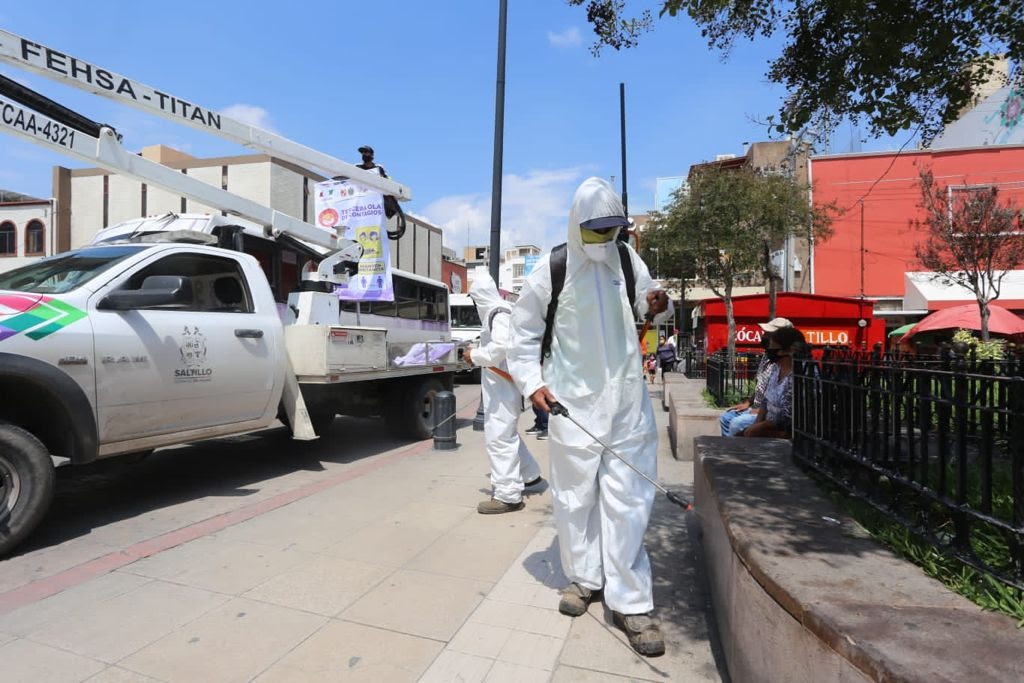 En seguimiento a los acuerdos establecidos por el Subcomité Técnico Regional Covid-19 Sureste, el Gobierno Municipal de Saltillo realiza tareas de concientización y de sanitización en la ciudad para disminuir los riesgos de contagio.