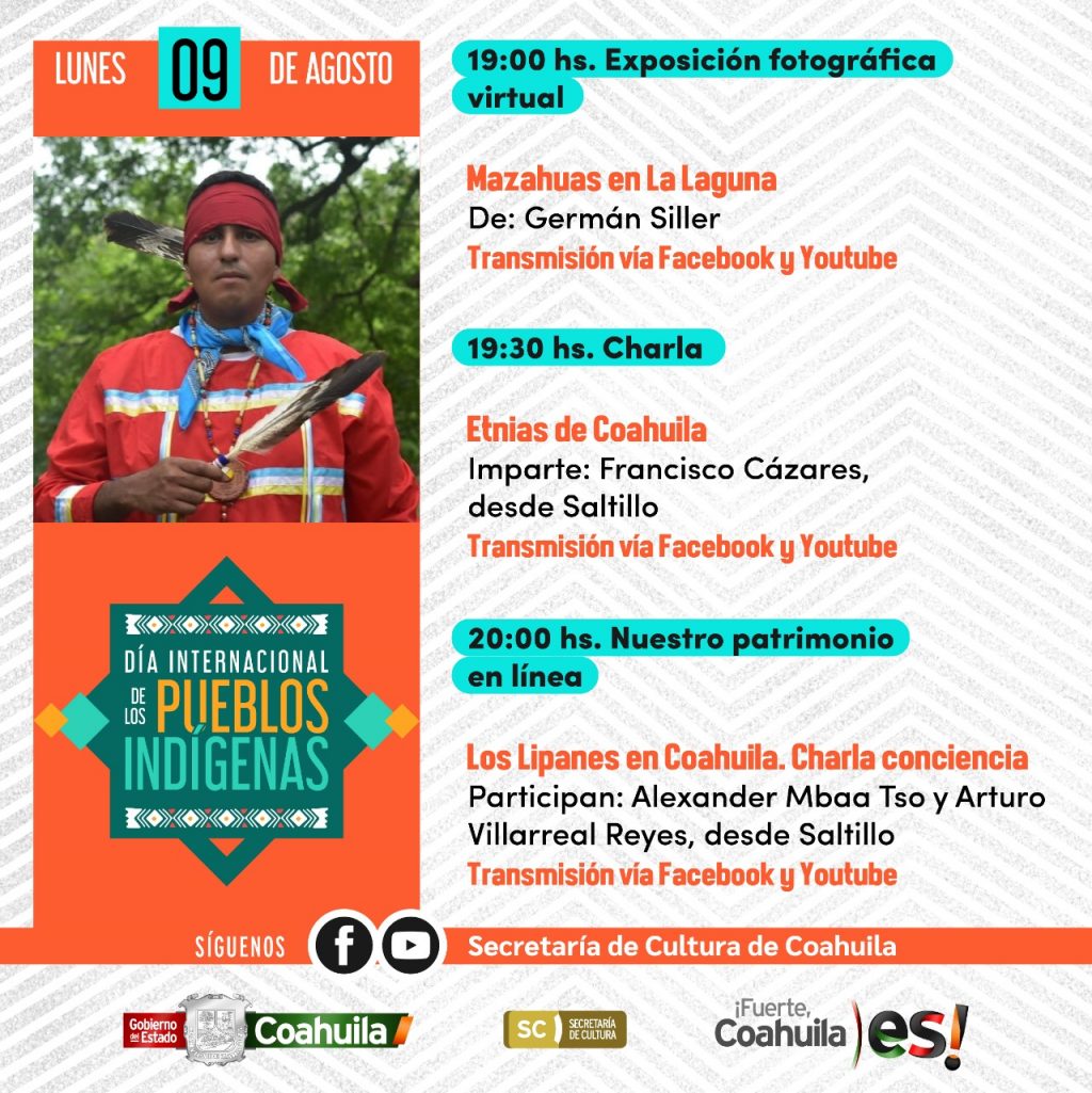 + La charla “Los Lipanes en Coahuila”, con la participación de Alexandres Mbaa Tso y Arturo Villarreal Reyes, a las 20:00 horas, vía Facebook y YouTube.