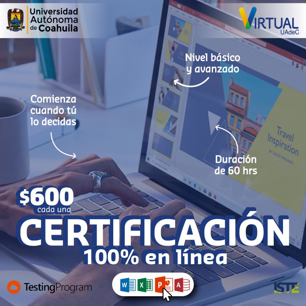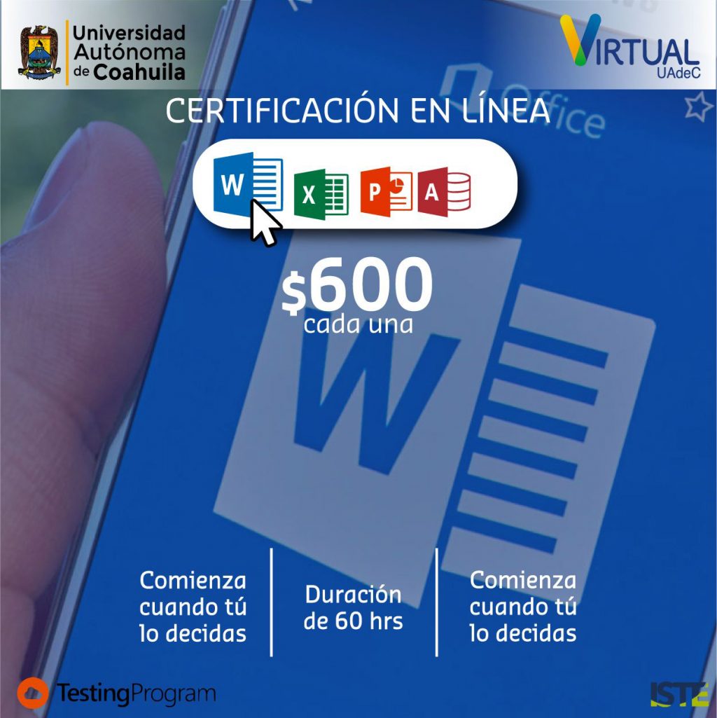 La Coordinación General de Educación a Distancia de la Universidad Autónoma de Coahuila, invita a certificarse internacionalmente en Microsoft Office a través de la Plataforma Testing Program, el costo del curso por aplicación para el público en general es de $600 pesos y para trabajadores y estudiante de la institución es de $500 pesos.