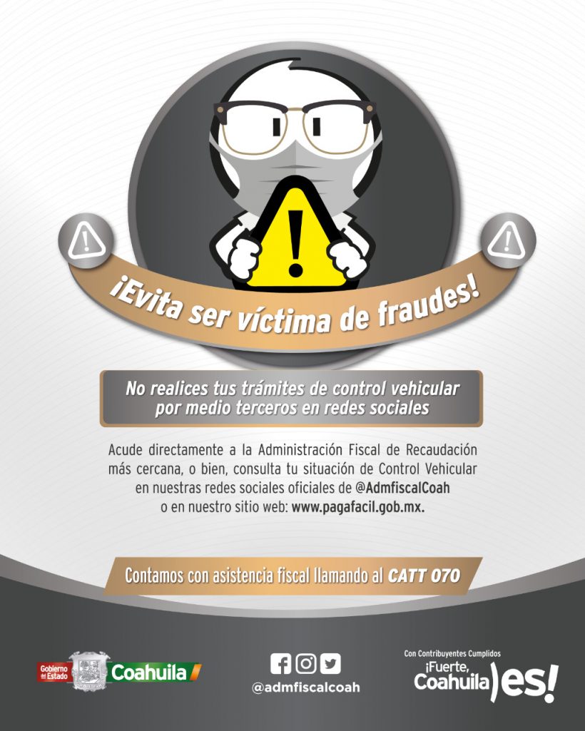 “No se dejen engañar, los servicios de la AFG son totalmente gratuitos, por lo tanto no necesitan de terceras personas a través de redes sociales para realizar sus trámites. Hay que tener cuidado con publicaciones falsas, las cuales ofrecen descuentos por distintos trámites de control vehicular, que son completamente ajenas al Gobierno del Estado de Coahuila”, alertó, Díaz González.
