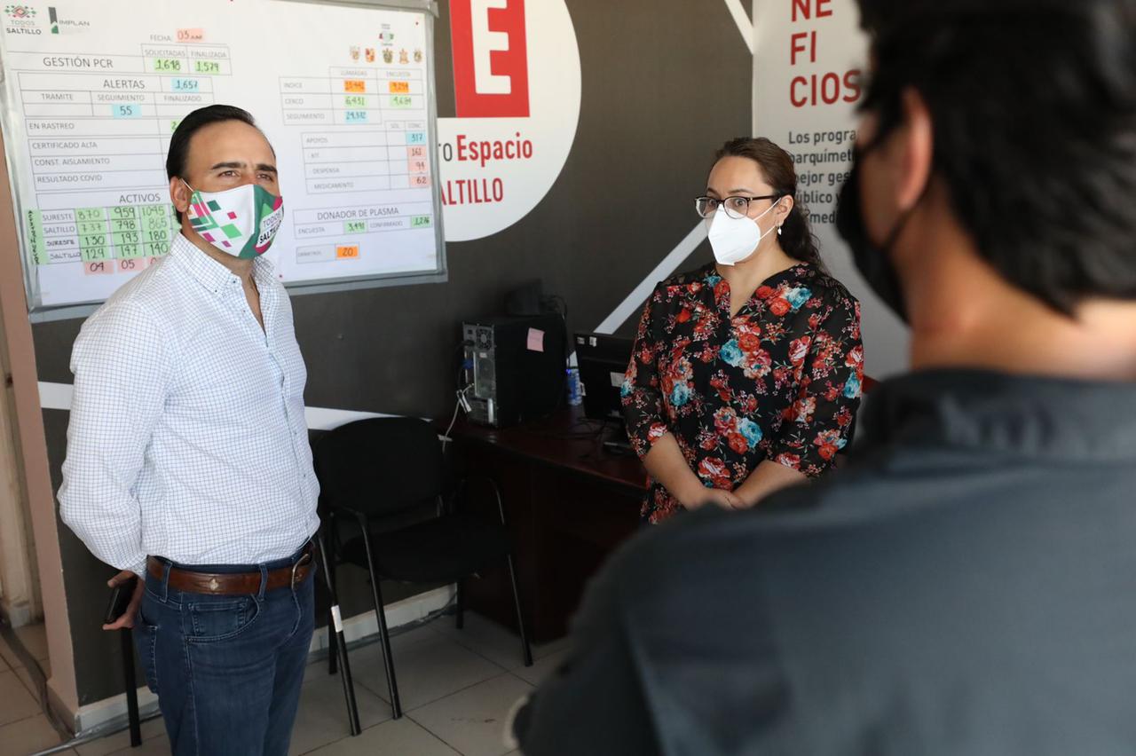 En seguimiento a las acciones de reforzamiento establecidas por parte del Subcomité Técnico Regional Covid-19 Sureste durante la tercera ola de contagios, el Call Center “Estamos Contigo” intensificará su trabajo para la conformación de los cercos sanitarios y evitar la propagación del virus, dio a conocer el alcalde de Saltillo, Manolo Jiménez Salinas, al realizar una visita para supervisar su funcionamiento.