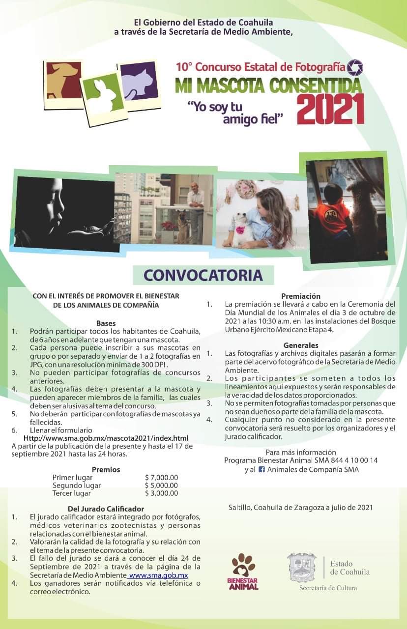 Con el interés de promover el bienestar de los animales de compañía, se lanza la convocatoria del 10° Concurso Estatal de Fotografía Mi Mascota Consentida 2021, “Yo soy tu amigo fiel”.