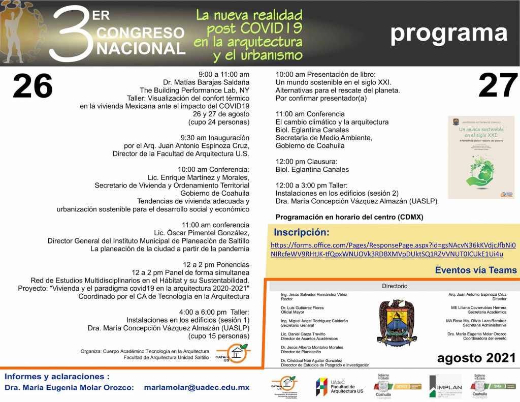 El registro para la tercera edición del Congreso Nacional “La Nueva Realidad Post COVID-19 en la Arquitectura y Urbanismo”, no tiene ningún costo y está disponible por medio del enlace: https://bit.ly/37wVaTZ, donde se enviarán por correo electrónico los enlaces de acceso a las salas de Microsoft Teams a los asistentes; en el caso de los participantes de los talleres, se notificarán los requerimientos necesarios para la capacitación.