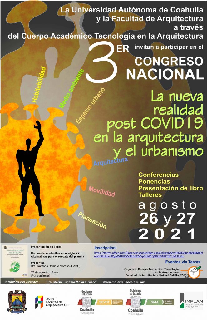 Con el objetivo de compartir experiencias y reflexiones sobre habitabilidad, medio ambiente, espacio urbano, arquitectura, movilidad y planeación, la Universidad Autónoma de Coahuila a través de la Facultad de Arquitectura, invita a la comunidad universitaria y al público en general, a la tercera edición del Congreso Nacional “La nueva realidad post COVID-19 en la arquitectura y urbanismo”, que se llevará a cabo el 26 y 27 de agosto por medio de Microsoft Teams.