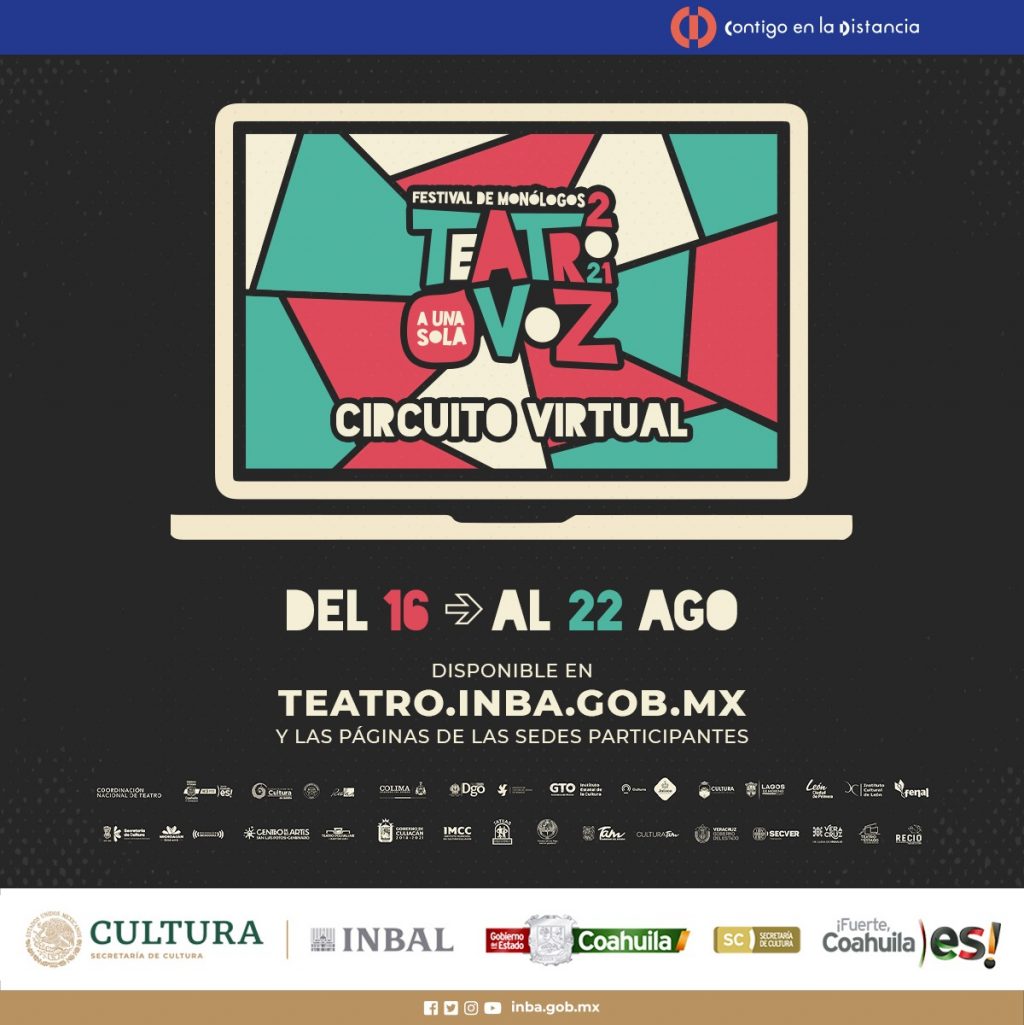 La Secretaría de Cultura dio a conocer que la XVI Edición del Festival de Monólogos, ‘Teatro a Una Sola Voz’, llegarán de manera virtual mediante las plataformas digitales de la Coordinación Nacional de Teatro y de las instancias de cultura participantes.