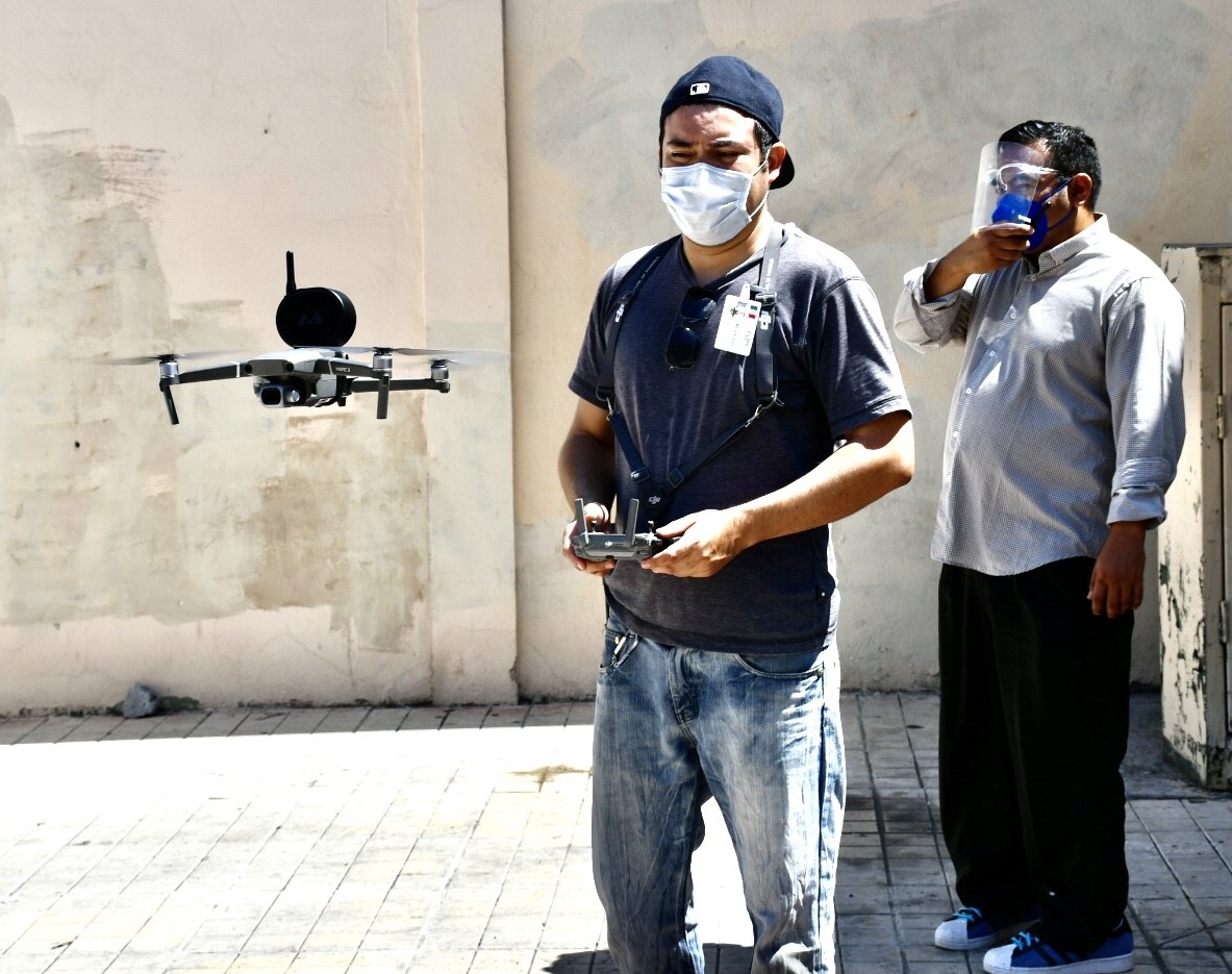 Marco y Eduardo recorren las calles y plazas públicas del centro histórico de la ciudad, punto donde se concentra la mayor cantidad de población en el área urbana de Saltillo. Con el apoyo de un dron tipo Mavic 2 pro y con una interfaz parlante que funciona como bocina la cual está adherida al cuerpo del dron es como realizan el perifoneo llamando a la ciudadanía a portar su cubrebocas.