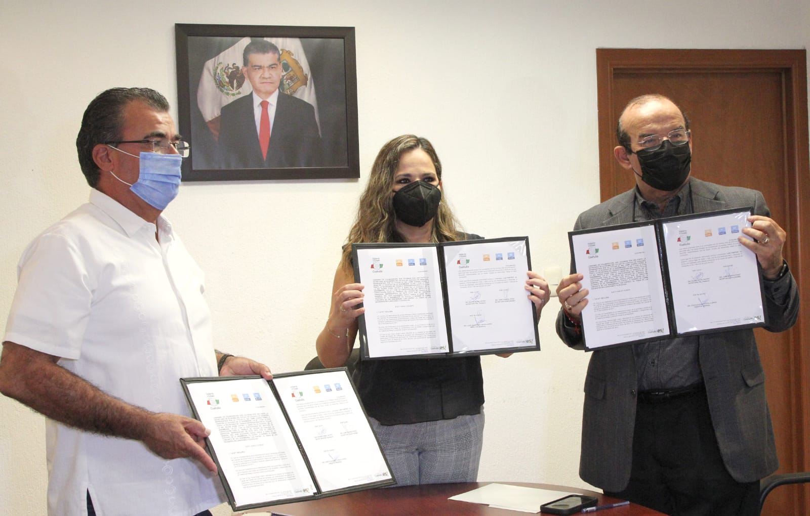 Los titulares de ambas dependencias estatales, Nazira Zogbi Castro y Jaime Guerra Pérez, respectivamente, signaron el acuerdo con el Director General del Instituto, José Alejandro Dávila Garza.