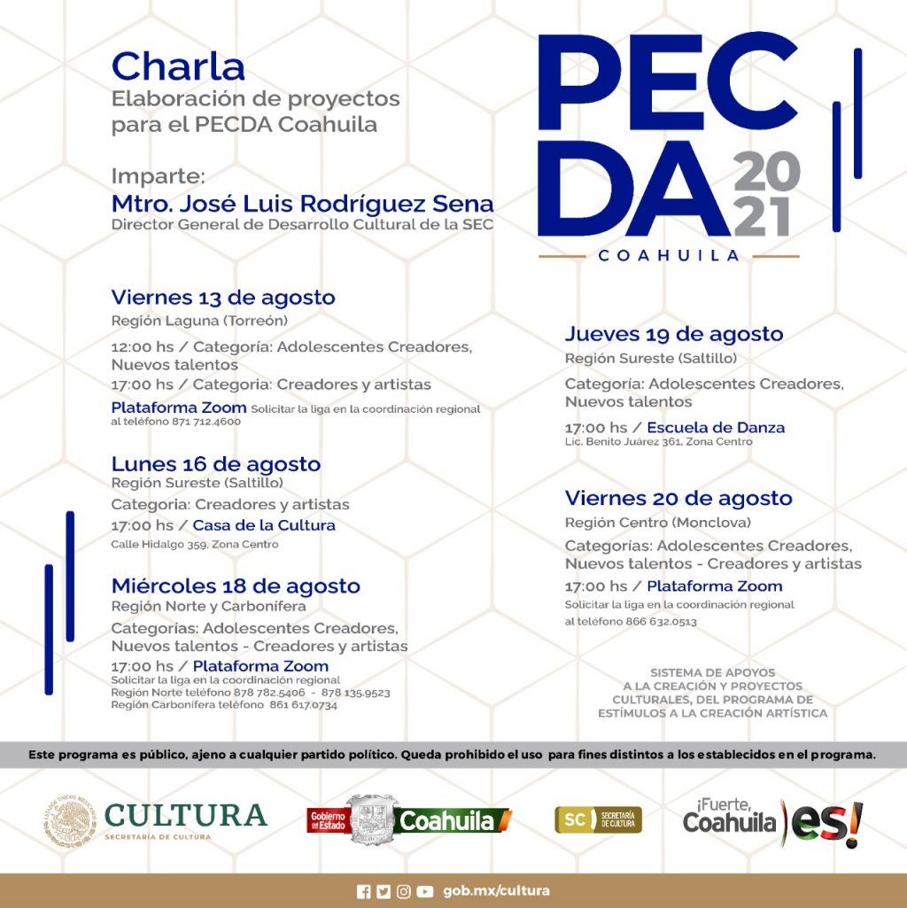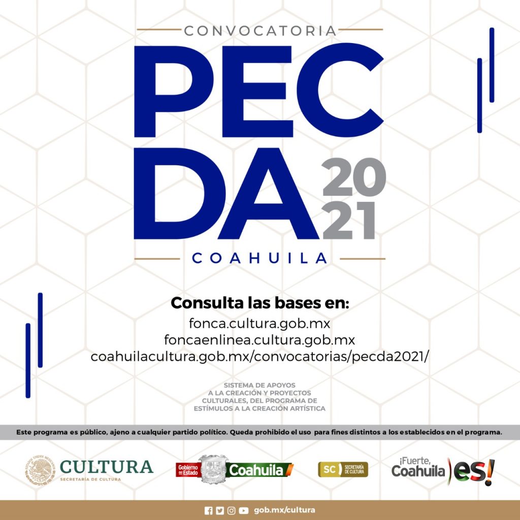 La Secretaría de Cultura coahuilense (SC) informa que la Convocatoria al Programa de Estímulo a la Creación y Desarrollo Artístico (PECDA) 2021 continúa abierta hasta el 8 de septiembre a las 15:00 horas.