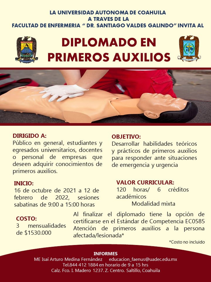 La Facultad de Enfermería “Dr. Santiago Valdés Galindo” de la Universidad Autónoma de Coahuila convoca a cursar el Diplomado en Primeros Auxilios que se llevará a cabo del 16 de octubre de 2021 al 12 de febrero de 2022.