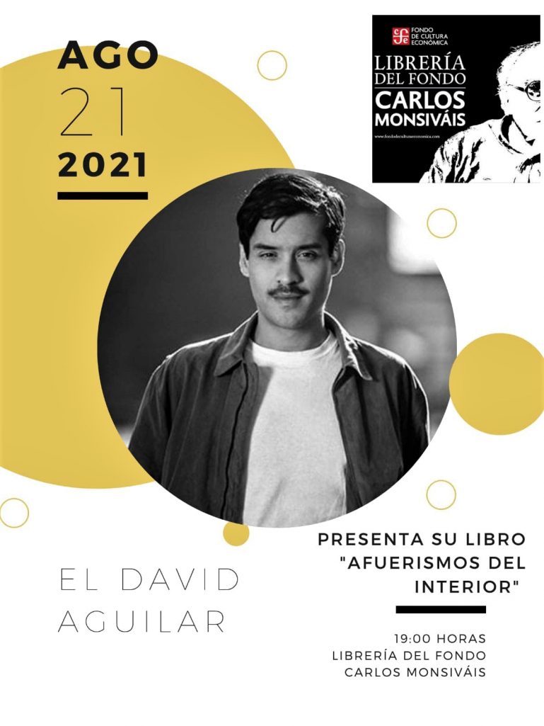 Este próximo sábado, a las 7:00 de la tarde, en la Librería del Fondo de Cultura Económica Carlos Monsiváis de Saltillo, el cantautor mexicano David Aguilar presentará su libro “Afuerismos del Interior”.