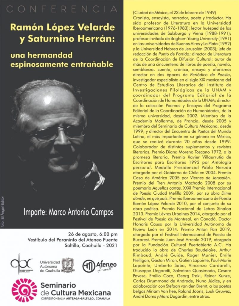 La Coordinación General de Difusión y Patrimonio Cultural de la Universidad Autónoma de Coahuila, invita a la conferencia “Ramón López Velarde y Saturnino Herrán: Una hermandad espinosamente entrañable” a cargo de Marco Antonio Campos y que se llevará a cabo el jueves 26 de agosto a las 18:00 horas en el vestíbulo del Ateneo Fuente.