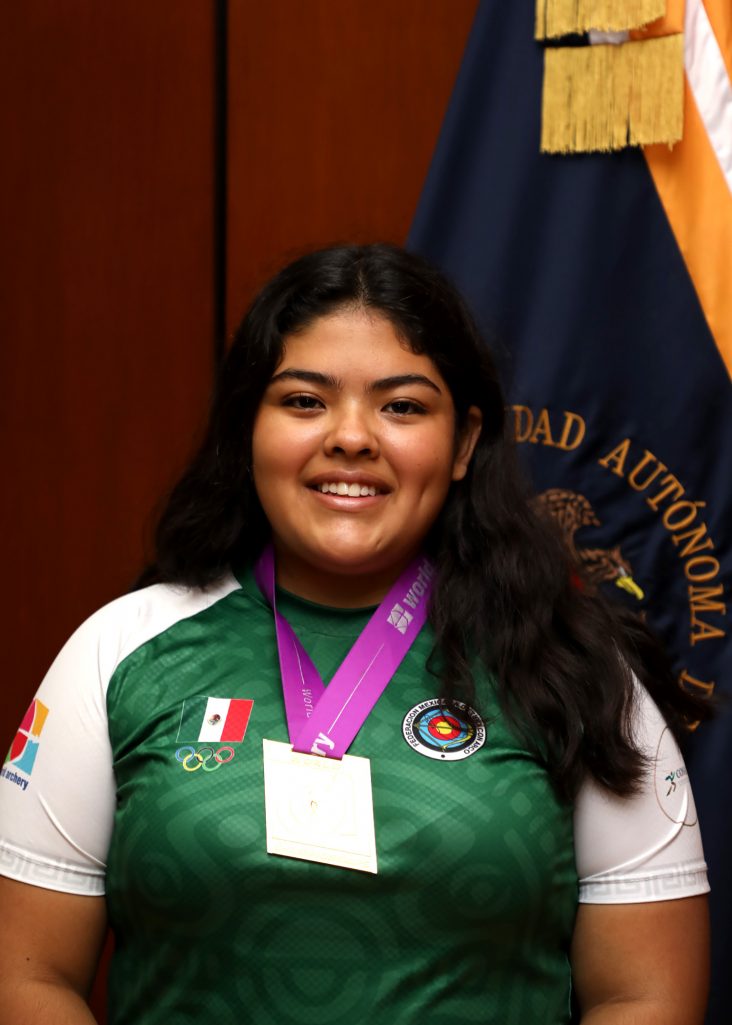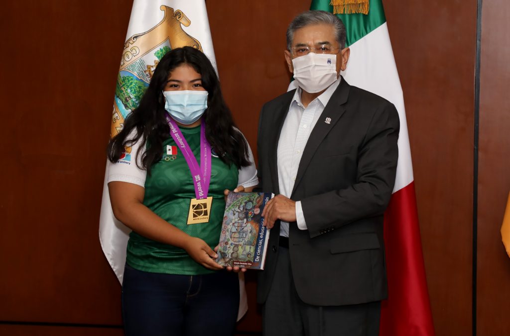 Este miércoles, el rector de la Universidad Autónoma de Coahuila, Salvador Hernández Vélez, recibió a Selene Rodríguez Riojas, estudiante de la Facultad de Ciencias Físico Matemáticas y campeona mundial juvenil de Tiro con Arco 2021, celebrado en Breslavia, Polonia del 9 al 15 de agosto.