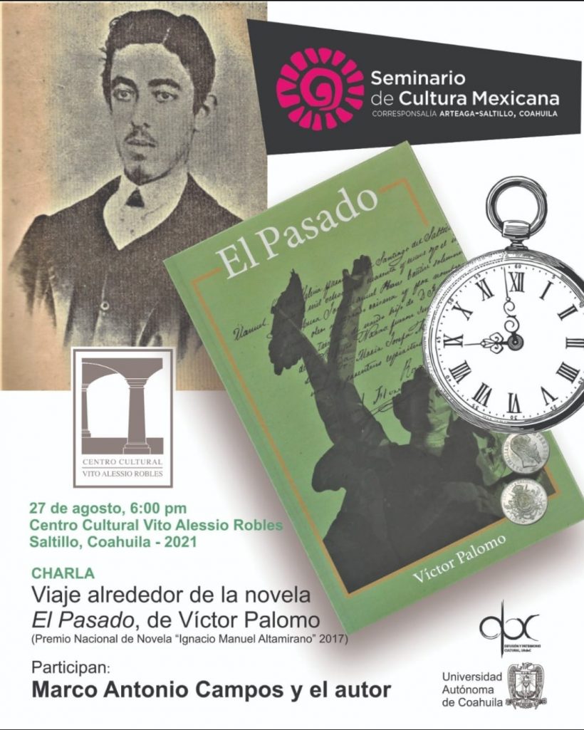 Como parte de las actividades de colaboración entre la Coordinación General de Difusión y Patrimonio Cultural de la Universidad Autónoma de Coahuila y el Seminario de Cultura Mexicana corresponsalía Arteaga, se impartirá la charla sobre la novela literaria “El Pasado” de Víctor Palomo, este próximo viernes 27 de agosto a las 18:00 horas en el Centro Cultural “Vito Alessio Robles”.