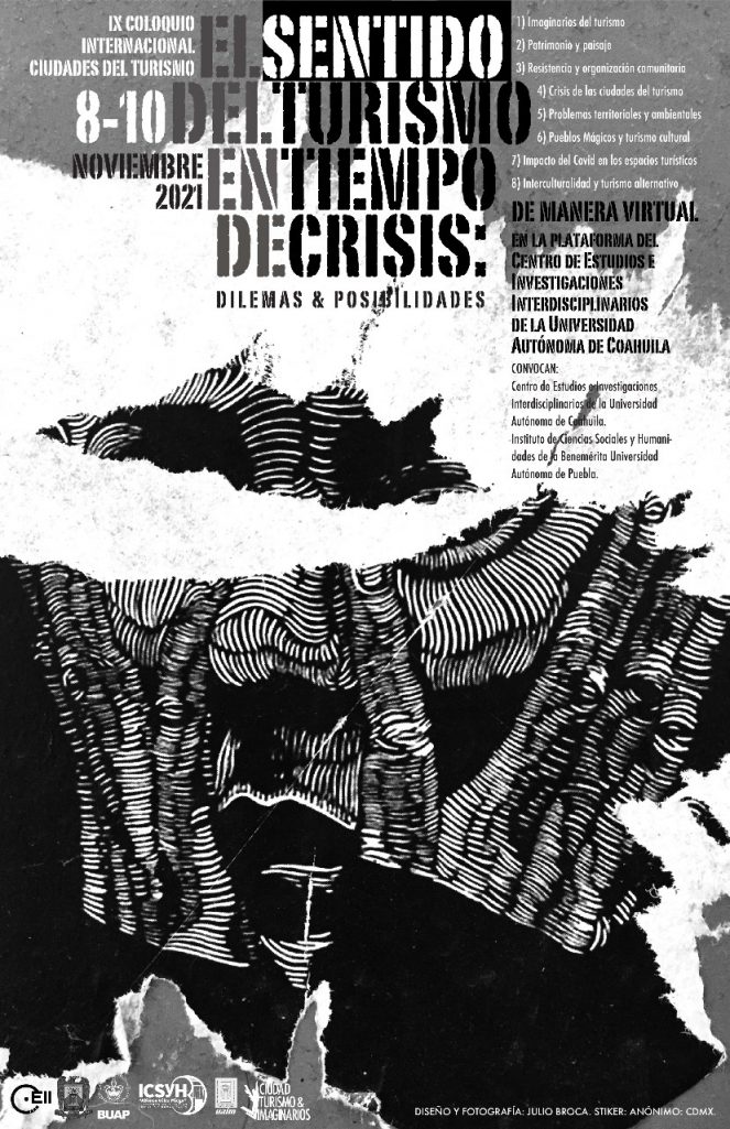 El Centro de Estudios e Investigaciones Interdisciplinarios (CEII) de la Universidad Autónoma de Coahuila en conjunto con el Instituto de Ciencias Sociales y Humanidades “Alfonso Vélez Pliego”, la Benemérita Universidad Autónoma de Puebla, la Universidad Autónoma Indígena de México y la Red Ciudad, Turismo e Imaginario, invitan a participar en el Noveno Coloquio Internacional Ciudades del Turismo “El sentido del turismo en tiempo de crisis: dilemas y posibilidades”, que se llevará a cabo del 8 al 10 de noviembre de 2021.