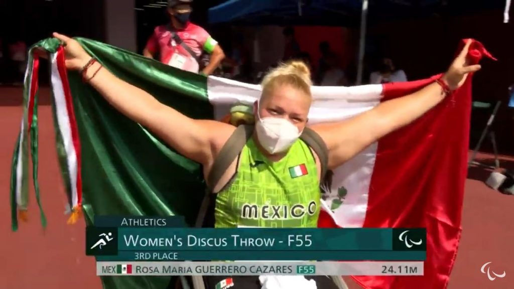 Tokio, Japón.- En su debut paralímpico, la sinaloense Rosa María Guerrero Cázares, conquistó la medalla de bronce en la final de lanzamiento de disco, categoría F55, tras lograr una marca de 24.11 metros, en el primer día del para atletismo de los Juegos Paralímpicos Tokio 2020, que se realizan en el Estadio Olímpico de Tokio.