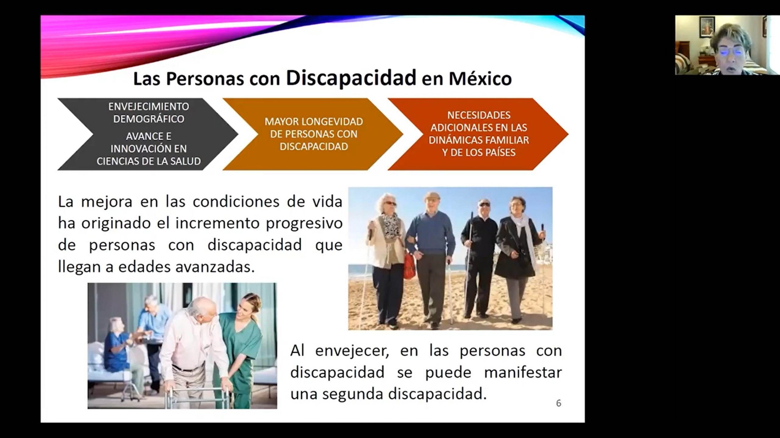 En el caso de México, añadió la especialista, el Censo 2020, realizado por el Instituto Nacional de Estadística y Geografía, demuestra que la discapacidad se concentra en personas mayores de 60 años de edad, quienes representan 50.1 por ciento de la población en esta condición. Y resaltó que por primera vez en este conteo se consideró la violencia como causa de discapacidad.