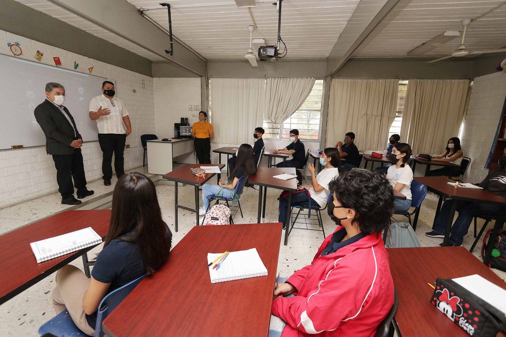 Al término del recorrido, el rector de la UA de C, Salvador Hernández, acudió a las aulas de primer semestre del programa de Bachillerato Bilingüe Progresivo, donde observó el esquema de clase híbrida, en el que 21 alumnos acuden de forma presencial y el resto de los estudiantes toma la sesión vía Microsoft Teams desde su casa.