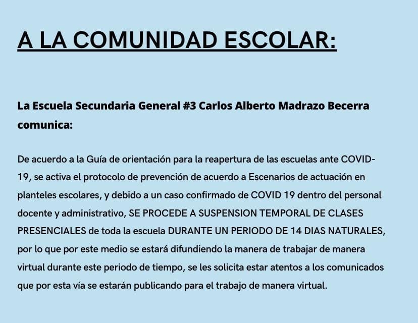 A través de redes sociales, autoridades de la escuela secundaria numero 3 ‘Carlos Alberto Madrazo Becerra’ ubicada en la colonia Villasol, al poniente de Ramos Arizpe informaron sobre la suspensión de clases presenciales debido a un caso positivo de Covid-19 entre el personal docente, descartando hasta el momento casos positivos entre alumnos.