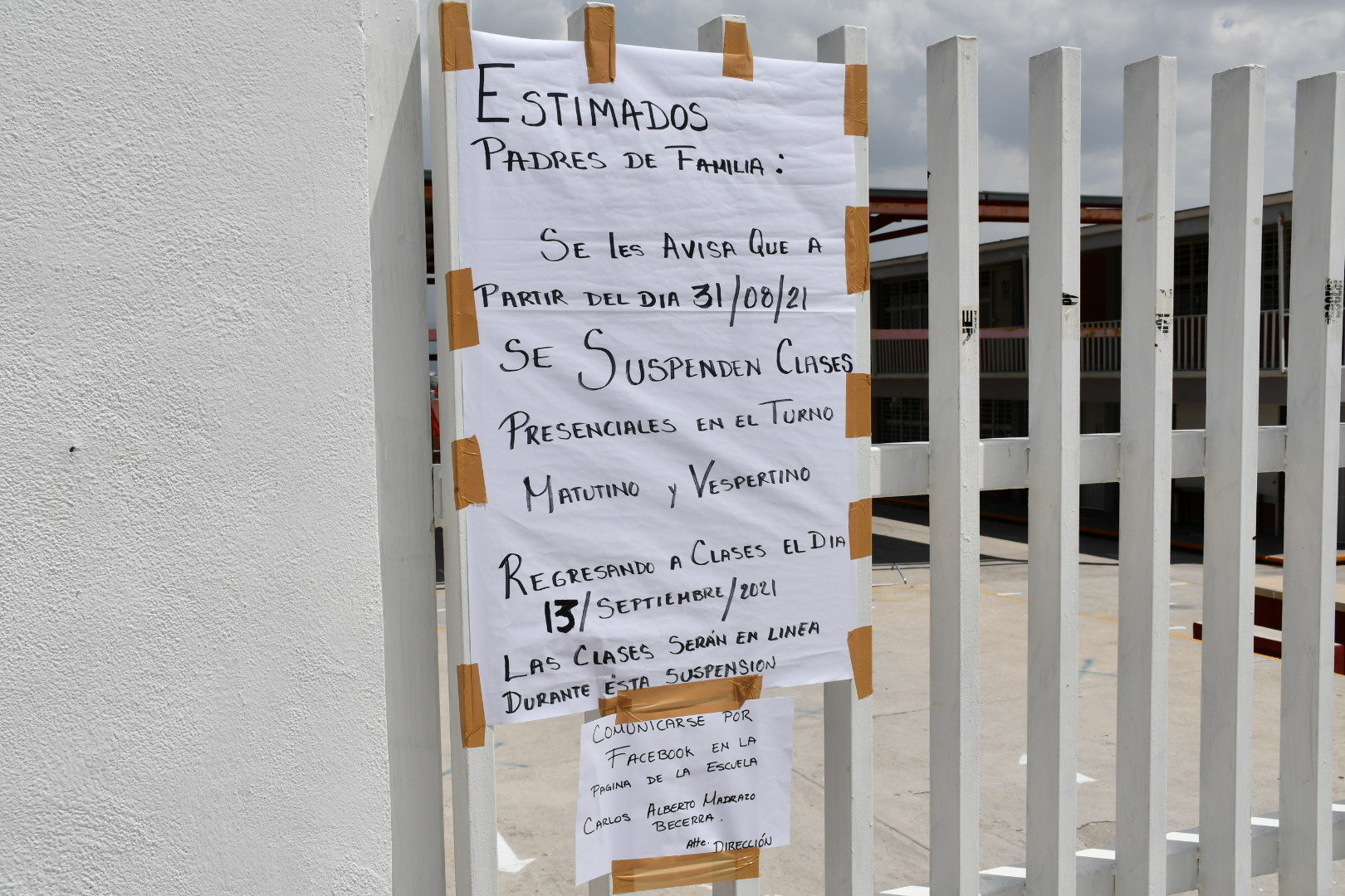 Al exterior de la institución educativa, directivos colocaron letreros dando aviso a padres de familia sobre la suspensión de las clases presenciales por un periodo de dos semanas optando por realizar las actividades en línea.
