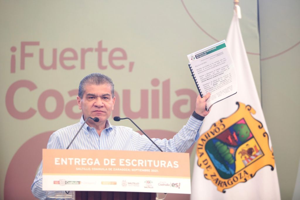 Así lo indicó el gobernador Miguel Ángel Riquelme Solís al entregar este viernes 200 escrituras a igual número de familias de 80 colonias y sectores populares de Saltillo, junto al alcalde Manolo Jiménez Salinas.