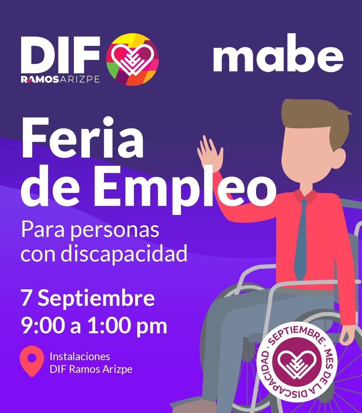 El Sistema DIF Ramos Arizpe en coordinación con la empresa Mabe, invitan a la Feria del Empleo para Personas con Discapacidad que habitan en esta ciudad, la cual se efectuará el martes 7 de septiembre en las instalaciones del DIF municipal.
