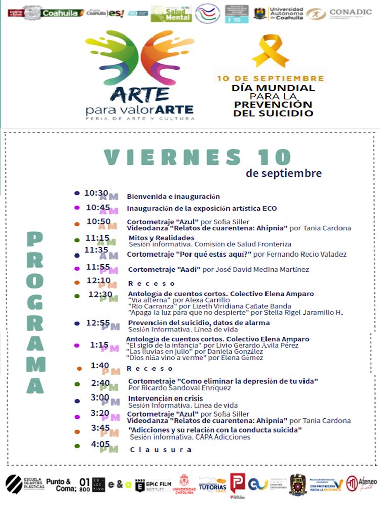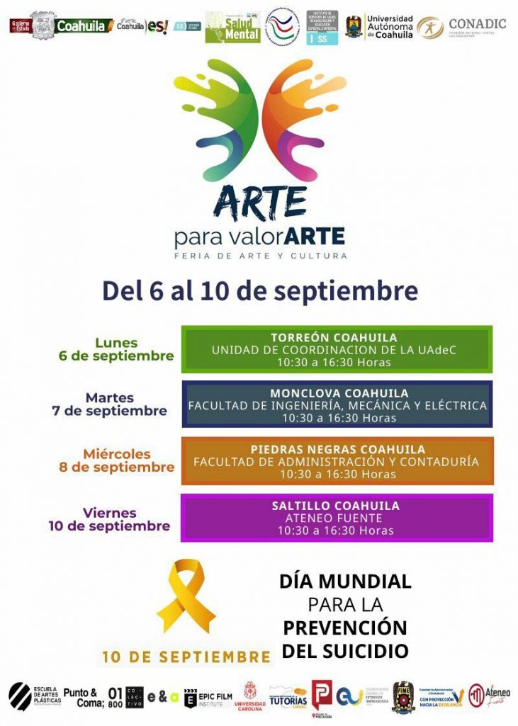 La Universidad Autónoma de Coahuila en colaboración con la Secretaria de Salud Estatal, está llevando a cabo “Arte para ValorArte” Feria de Arte y Cultura, la cual tiene como objetivo conmemorar el Día Mundial de la Prevención del Suicidio, que es el 10 de septiembre desde el 2003, cuando la Organización Mundial de la Salud así lo estableció.