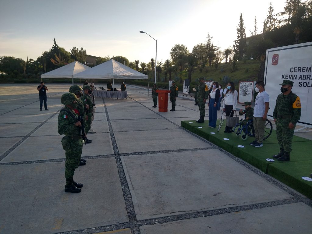 Acompañado de sus padres, el Cabo Oficinista Ramón Abraham Rodríguez Hernández, y la señora Rosario Quintana, Kevin Abraham se mostró emocionado de vestir el uniforme del Ejército Mexicano, y recibió con alegría el saludo de los elementos castrenses que participaron en la ceremonia, que incluyó por supuesto, los honores a la bandera y el pase de lista.