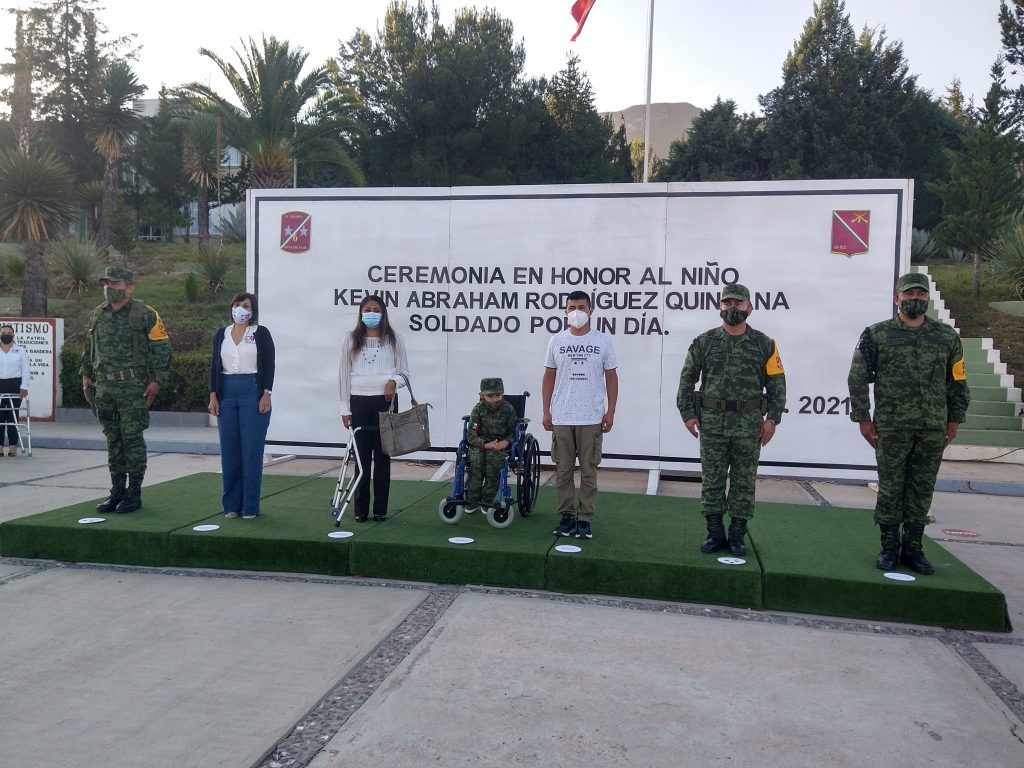 Este miércoles en instalaciones del 69 Batallón de Infantería, se llevó a cabo una ceremonia en el marco del programa “Soldado por un Día”, de la Secretaría de la Defensa Nacional (SEDENA), en la que fue homenajeado el pequeño Kevin Abraham Rodríguez Quintana, de 9 años, quien de esta manera cumplió su sueño de formar parte de las Fuerzas Armadas y conocer de cerca las actividades que realizan sus elementos.