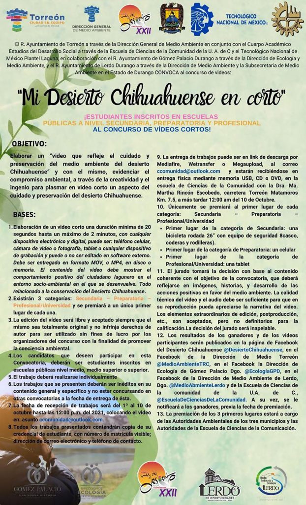 La convocatoria está dirigida a estudiantes inscritos en escuelas públicas a nivel secundaria, preparatoria y profesional y tiene como objetivo la elaboración de un video que refleje el cuidado y preservación del medio ambiente del Desierto Chihuahuense a través del comportamiento positivo del ciudadano lagunero en el entorno socio-ambiental en el que se desenvuelve, así como evidenciar el compromiso ambiental, a través de la creatividad y el ingenio.