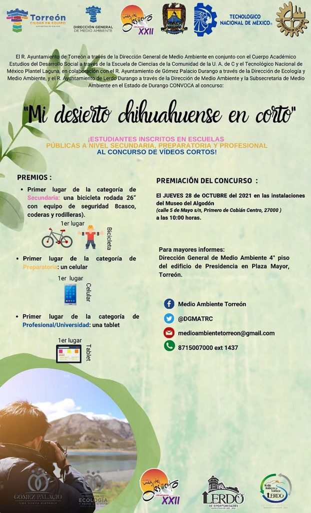 Torreón, Coahuila.- La Universidad Autónoma de Coahuila a través de la Escuela de Ciencias de la Comunidad Unidad Torreón y su Cuerpo Académico “Estudios del Desarrollo Social”, en conjunto con la Dirección General de Medio Ambiente del municipio de Torreón, el Tecnológico Nacional de México Plantel Laguna, la Dirección de Ecología y Medio Ambiente del Ayuntamiento de Gómez Palacio Durango y la Dirección de Medio Ambiente y la Subsecretaria de Medio Ambiente del estado de Durango, convocan al concurso de videos “Mi Desierto Chihuahuense en Corto”.