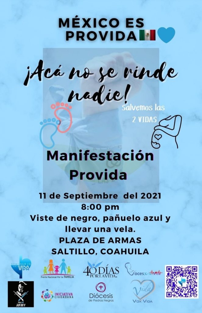 Asociaciones e instituciones como Frente Nacional por la Familia, 40 Días por la Vida, Voces por la Vida, Prolife Army y la Diócesis de Piedras Negras convocan a una manifestación en contra del aborto que se realizará este sábado a las 8:00 de la noche en la Plaza de Armas de Saltillo.