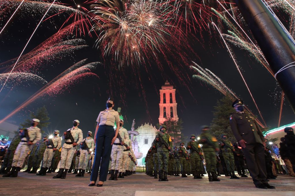 En Saltillo, esta noche fueron 200 elementos de las Fuerzas Armadas, tanto del Ejército Mexicano, Guardia Nacional, Policía Estatal, Policía y Tránsito Municipal y del GRS, quienes ocuparon la explanada de la Plaza de Armas justo enfrente del balcón de Palacio de Gobierno, desde donde el Mandatario estatal pronunció la arenga.