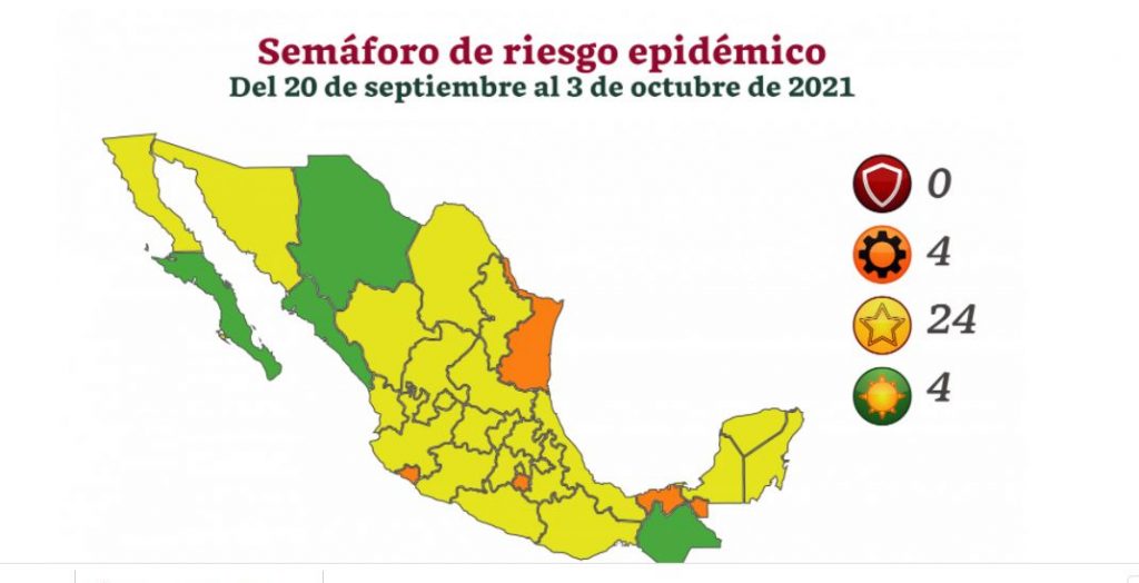 UNOT TV publicó que la dependencia federal también informó que hay cuatro estados en color verde (riesgo bajo); 23 en amarillo (riesgo medio); cuatro en naranja (riesgo alto) y ninguno en rojo (máximo riesgo).