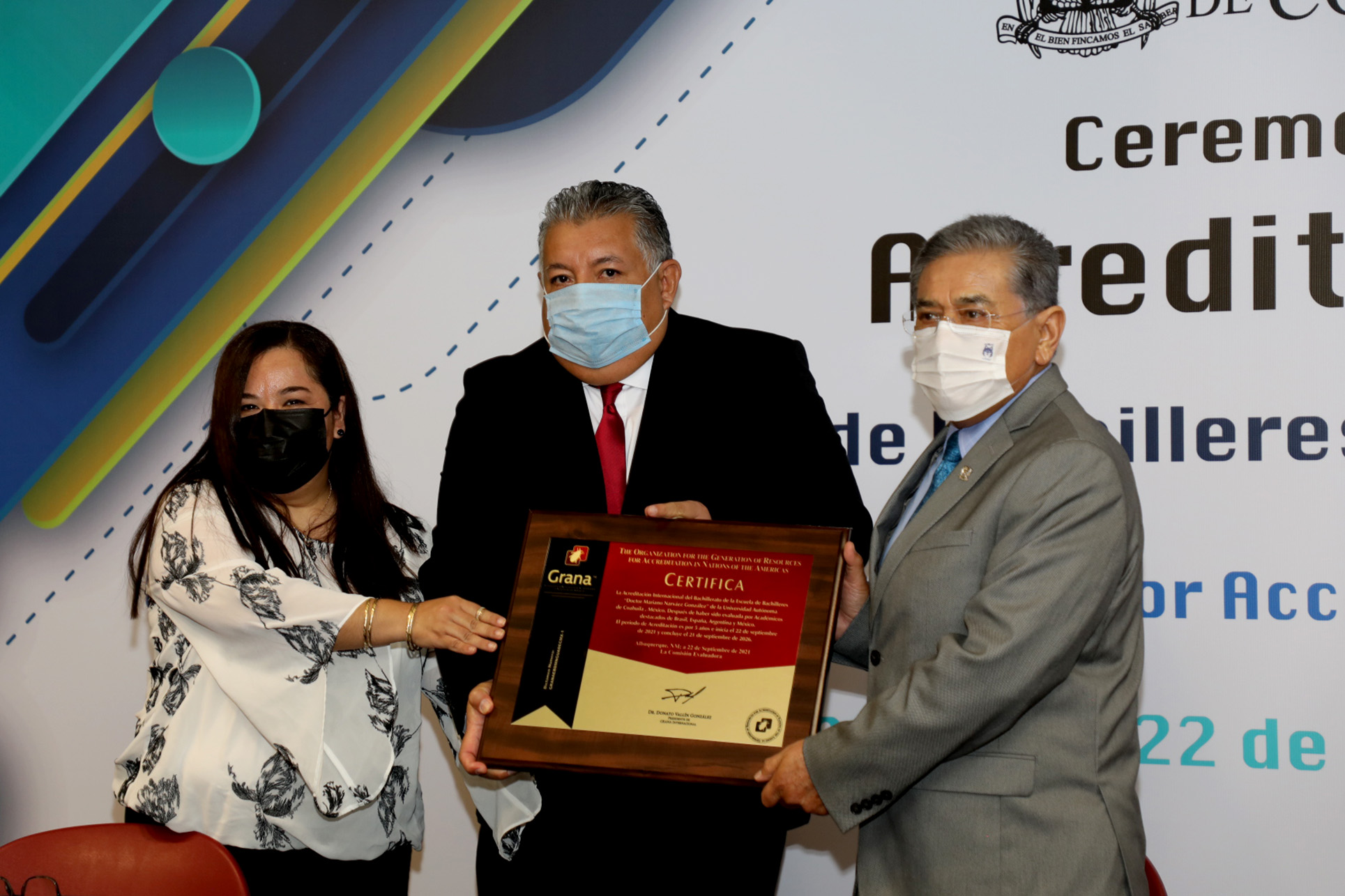 En la ceremonia de acreditación, se contó con la presencia del rector Salvador Hernández Vélez, el coordinador de la Unidad Saltillo, Julio Saucedo Zul, el coordinador general de Relaciones Internacionales, José Manuel Morales Santoyo, la directora de la Preparatoria “Dr. Mariano Narváez González”, Claudia Elena García Vega y el director general de GRANA, Donato Vallín.