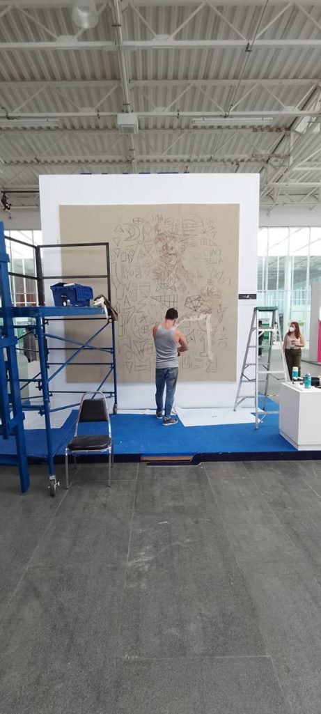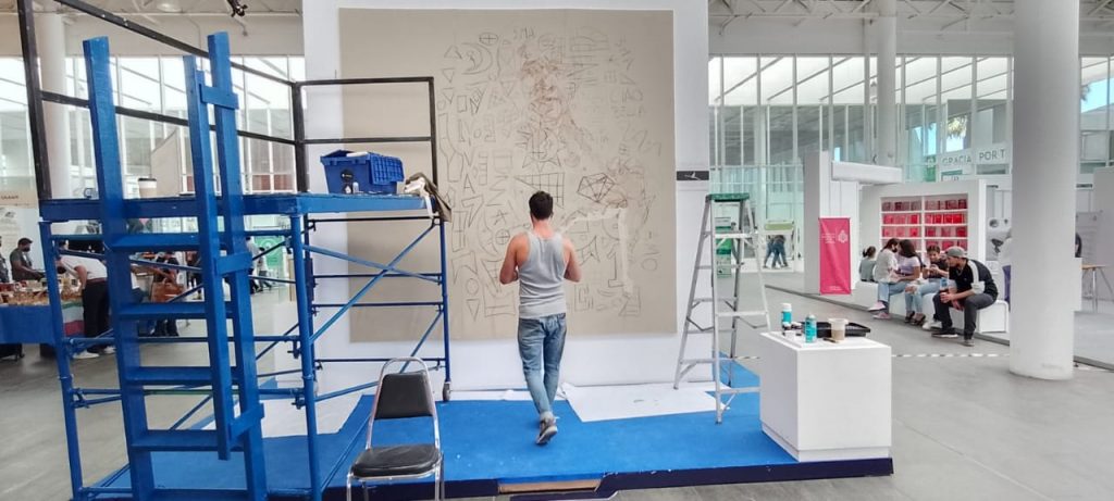 Filippo Giusti es oriundo de Italia, pero radicado en México hace tiempo, y tiene la encomienda de terminar el mural oficial de la FILC para entregarlo el día de la clausura, que será el domingo 26 de septiembre.
