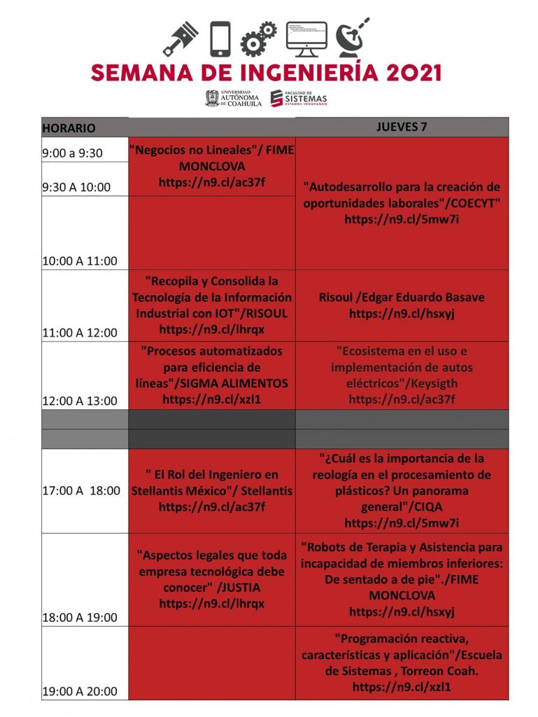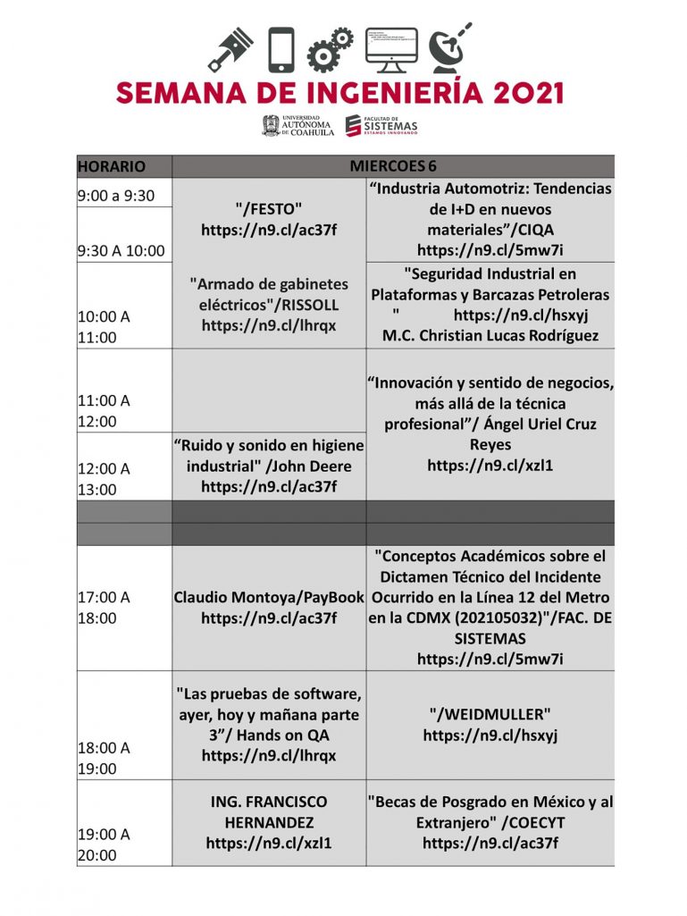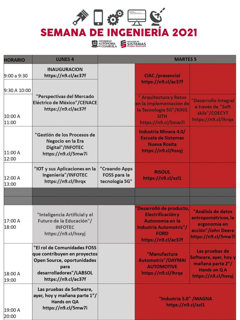 Asimismo, las conferencias y talleres programados para los días martes, miércoles y jueves tendrán horario de 9:00 a 13:00 horas y de 17:00 a 20:00 horas, mientras que el viernes, el evento se efectuará sólo de 9:00 a 13:00 horas; para consultar el programa completo de la “Semana de Ingeniería 2021” y solicitar las ligas de acceso a las salas de Microsoft Teams, visitar en Facebook: “Facultad de Sistemas U. A. de C. Oficial”.