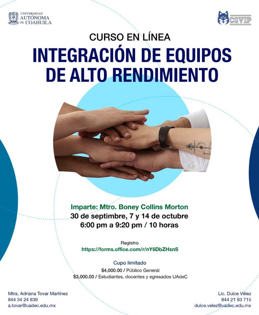 La Coordinación General de Vinculación e Innovación Productiva de la Universidad Autónoma de Coahuila, convoca a la comunidad universitaria y al público en general a inscribirse en el curso en línea “Integración de Equipos de Alto Rendimiento”, que se llevará a cabo el 30 de septiembre y el 7 y 14 de octubre de 2021 a través de la plataforma Microsoft Teams.