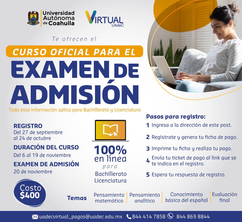 Para más información ingresar a la página http://www.cged.uadec.mx/cursodepreparacion/ visitar el Facebook “UAdeC Virtual” o comunicarse a los teléfonos (844) 4 14 78 58, (844) 4 14 81 02 y (844) 4 10 99 54 y vía WhatsApp al (844) 869 8844. (EL HERALDO)