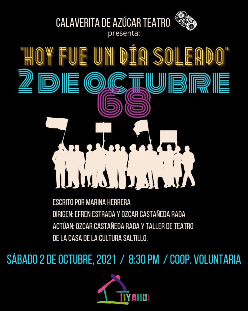 El Grupo de Teatro Calaverita de Azúcar realizará este sábado a las 8:30 de la noche en Casa Tiyahui de Saltillo el performance «Hoy fue un Día Soleado», compuesto de danza, música y dramatización para recordar al movimiento estudiantil y su dispersión el 2 de octubre de 1968.