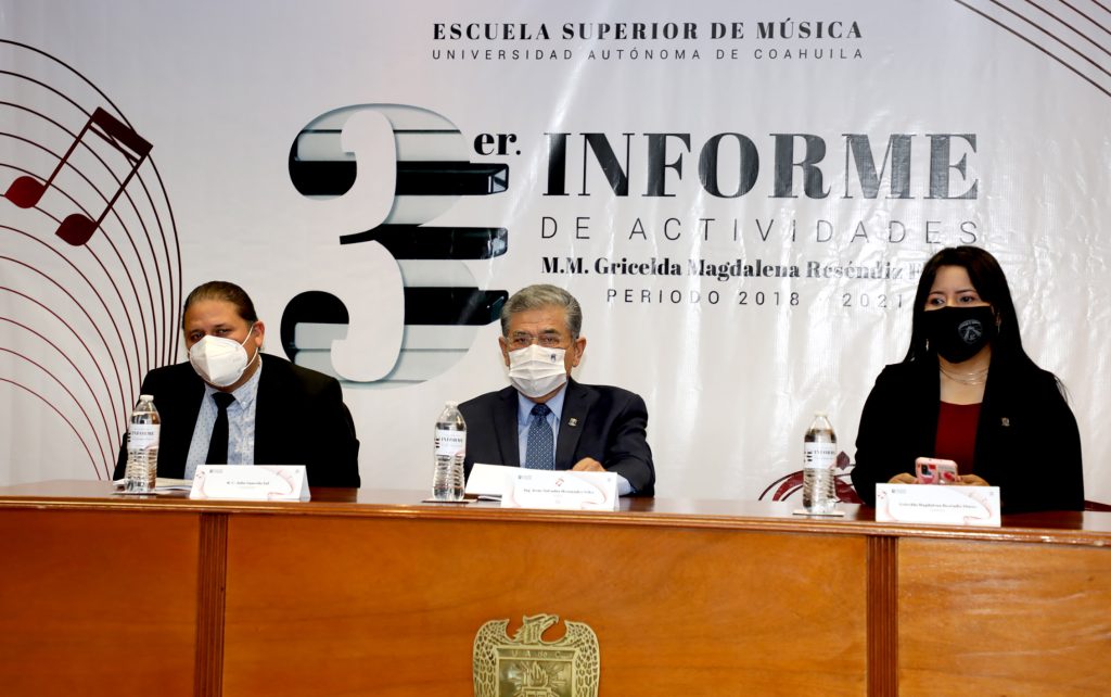 En atención al principio de transparencia en la Universidad Autónoma de Coahuila, la directora de la Escuela Superior de Música, Gricelda Magdalena Reséndiz Flores, presentó su tercer informe de actividades correspondiente al periodo 2020-2021 al frente del plantel.