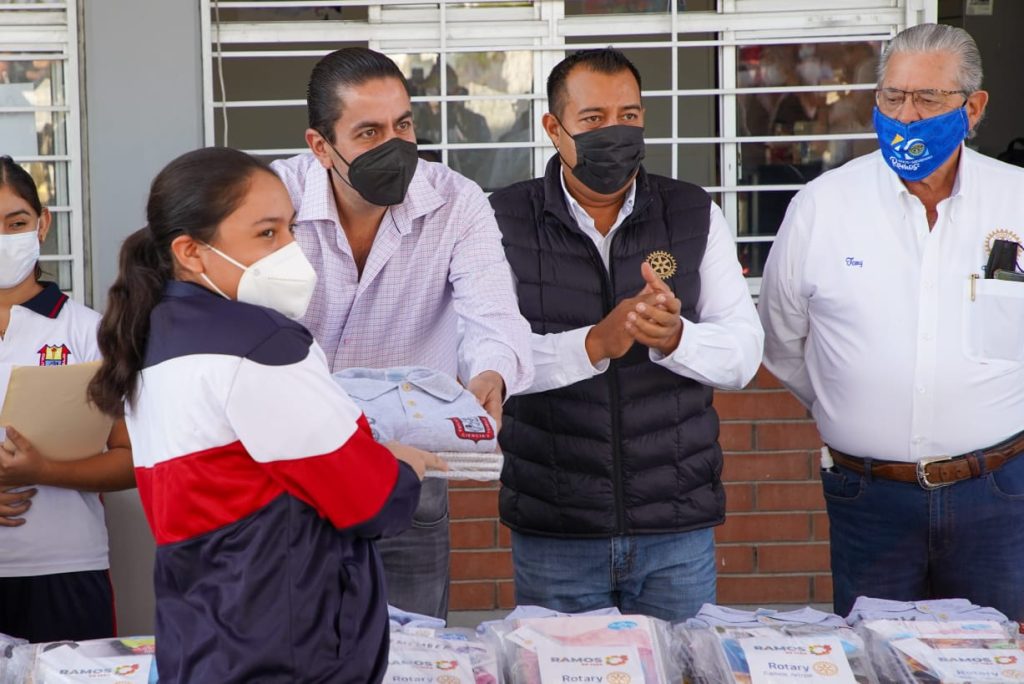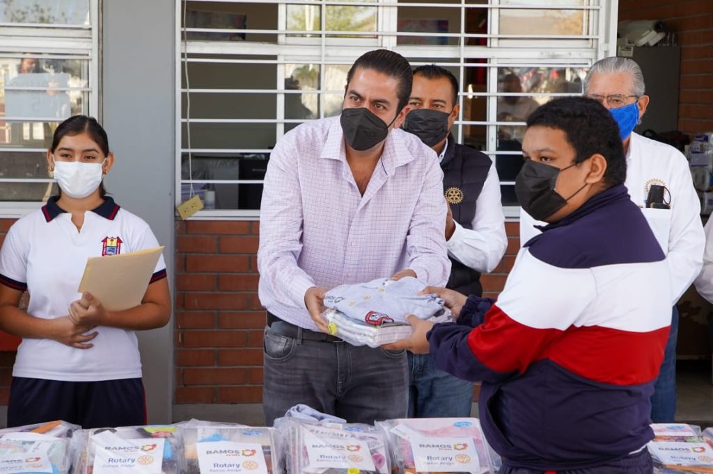 Este jueves el alcalde de Ramos Arizpe, Chema Morales Padilla, acompañado de Ricardo Marcos Garza, Gobernador Rotario del Distrito 4110 y de Mario Aguirre Rangel, Presidente del Club Rotario, entregaron a través del programa social “Vamos de la mano juntos por Ramos Arizpe” paquetes escolares a los alumnos de la Secundaria Técnica No. 3, Carlos Madrazo.