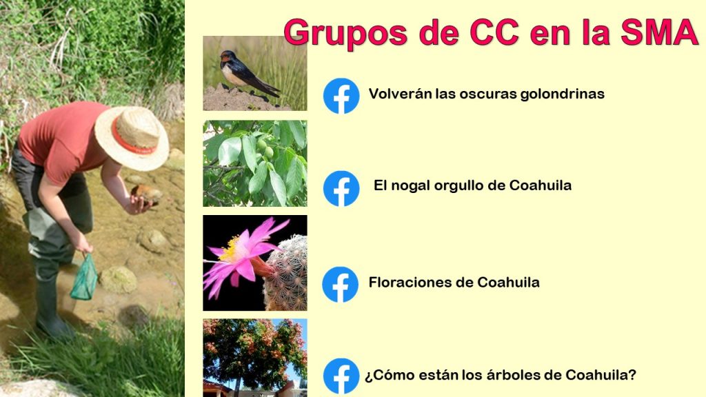 Eglantina Canales Gutiérrez, titular de la dependencia, explicó que con ese objetivo se implementaron los llamados Grupos de Ciencia Ciudadana, como los siguientes: Perro Callejero; Nogal, orgullo de Coahuila; Volverán las oscuras golondrinas; Floraciones de Coahuila; Caracoles y cochinillas, y  ¿Cómo están los árboles de Coahuila?, añadió la funcionaria estatal.