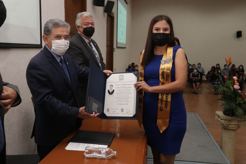 Las autoridades entregaron los títulos que acreditan la formación profesional de la generación 53 de la Licenciatura de Contaduría Pública, de la generación 53 de la Licenciatura en Administración de Empresas, de la generación 37 de la Licenciatura en Administración de Recursos Humanos y la cuarta generación de la Licenciatura en Negocios Internacionales; de igual forma, se entregaron los diplomas a los mejores promedios de cada carrera. (EL HERALDO)