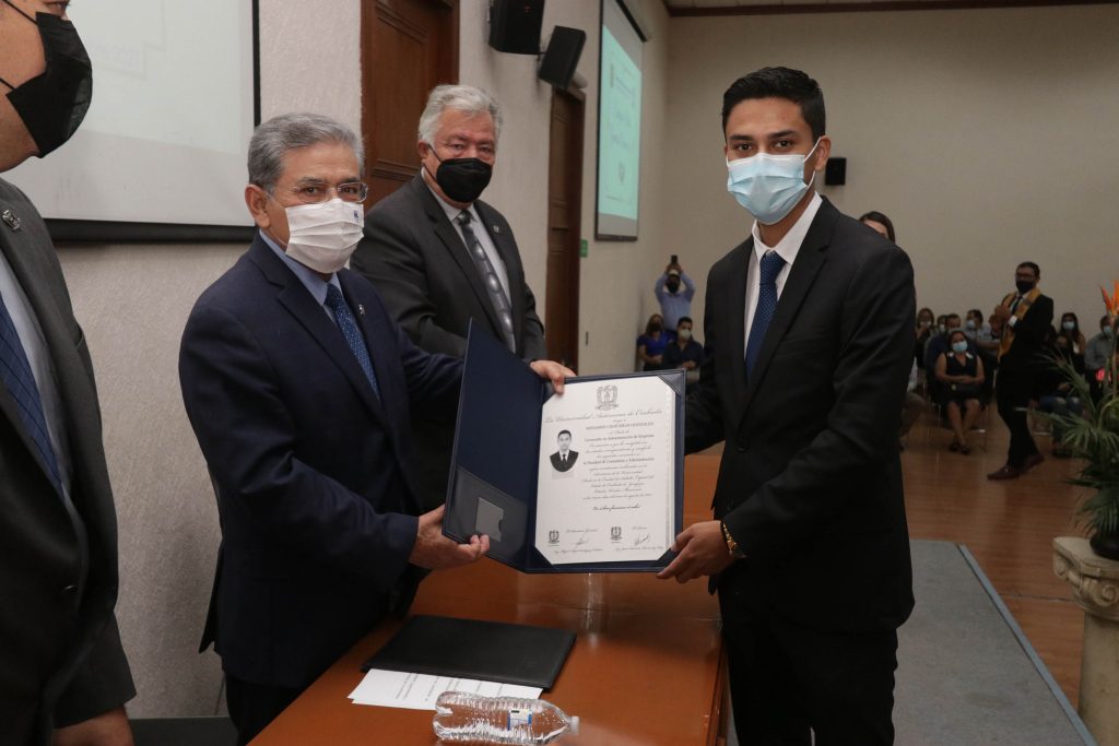 En ceremonia solemne efectuada en la Sala de Seminarios de la Unidad Norte, y en presencia del coordinador de la Unidad, Juan Carlos Talamantes Arredondo, del director de la FCA Monclova, Gabriel Aguilera Mancilla, así como de egresados y sus familias, el Rector felicitó a los estudiantes de la generación diciembre 2020, quienes recibieron sus documentos por la culminación de sus estudios.