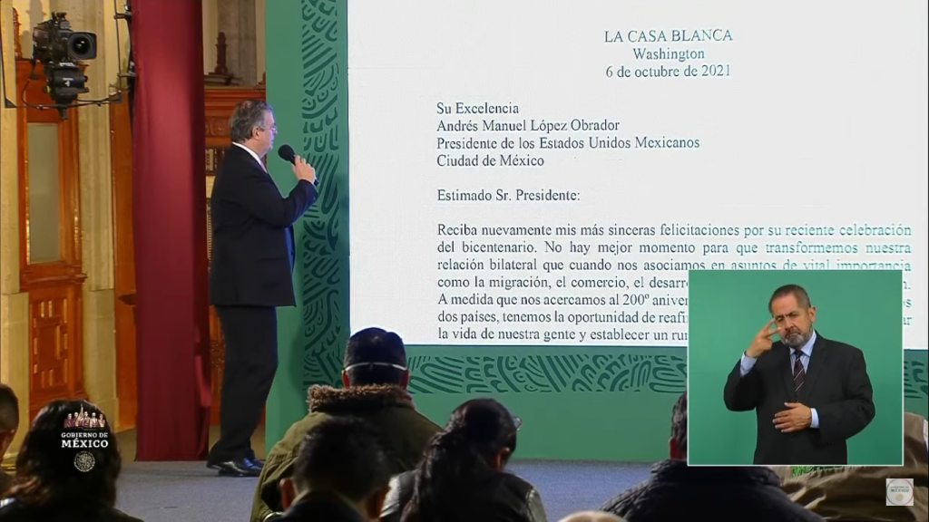 En conferencia de prensa desde Palacio Nacional, el canciller Marcelo Ebrard leyó este lunes la misiva donde Biden afirma que su gobierno ha dispersado alrededor de 600 millones de dólares en ayuda para el desarrollo para los gobiernos de Centroamérica.