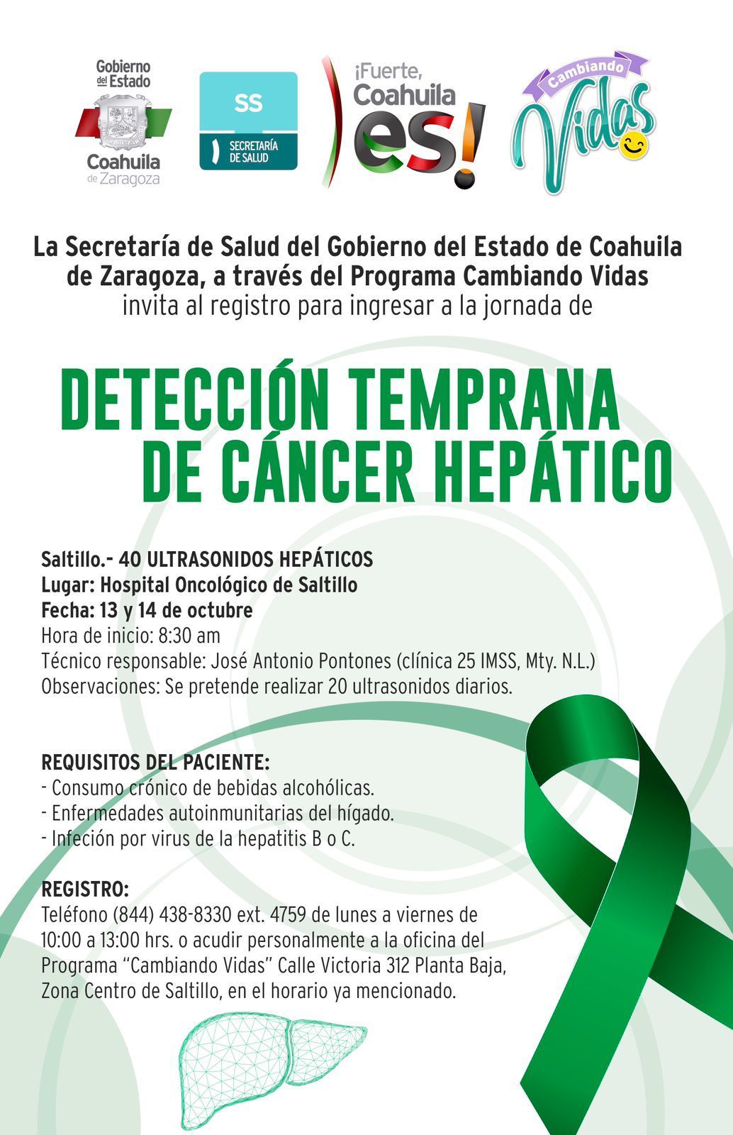 Saltillo, Coahuila de Zaragoza; a 11 de Octubre del 2021.- A través del programa de cirugías gratuitas “Cambiando Vidas”, la Secretaría de Salud de Coahuila arrancará la Jornada de Detección de Cáncer Hepático.