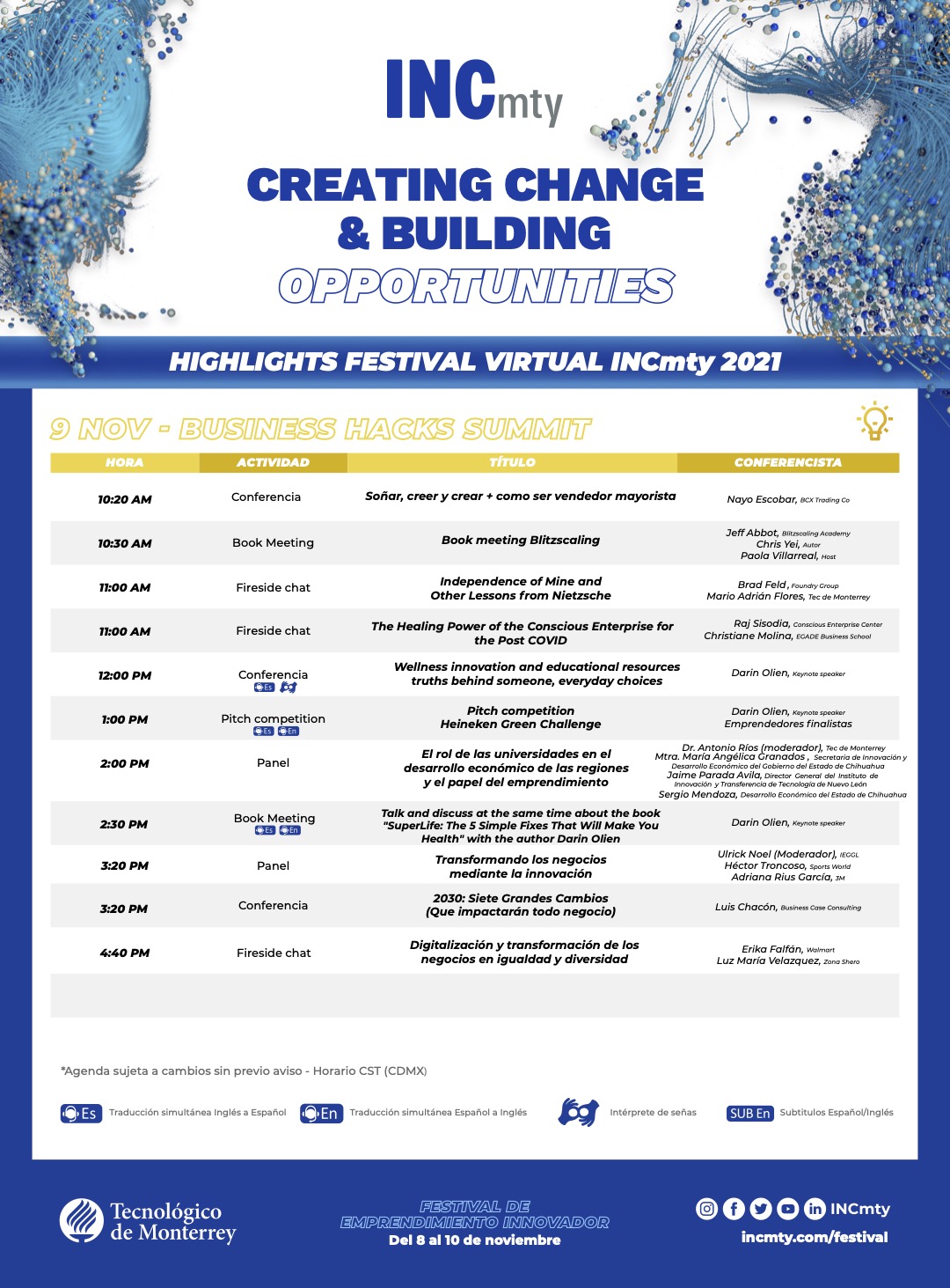 Monterrey, N.L.- INCmty, la plataforma de emprendimiento del Tecnológico de Monterrey y que ha motivado a miles de personas de México y Latinoamérica a alcanzar sus metas, presenta las actividades más relevantes del summit Business Hacks que se llevará a cabo durante el festival virtual. Durante este summit se abordarán un amplio abanico de temas que van desde la necesidad de innovar en la educación para mejorar el bienestar de las personas, las perspectivas de Nietzsche sobre el emprendimiento moderno, el impacto que pueden tener las empresas solidarias en la recuperación posterior al COVID, experiencias personales, las nuevas redes sociales y su impacto para las empresas, cultura financiera hasta el rol de las universidades en el desarrollo económico de las regiones entre muchos otros temas.