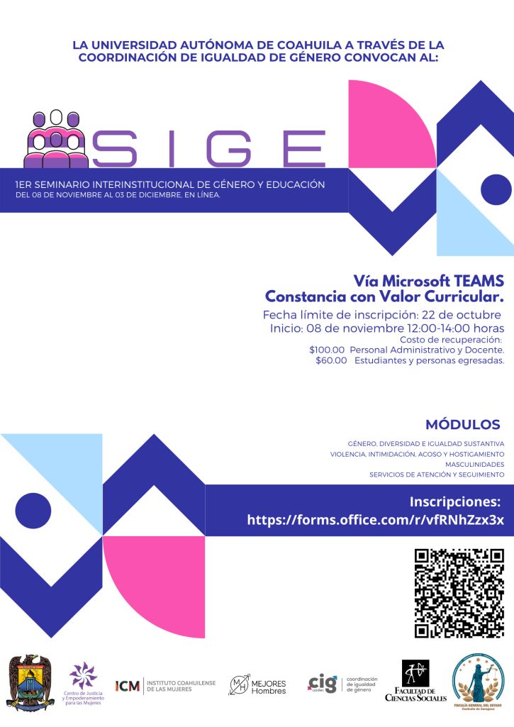 El seminario se desarrollará de manera virtual a través de la plataforma Microsoft Teams y los interesados deberán de registrarse antes del 22 de octubre en el siguiente link https://forms.office.com/r/vfRNhZzx3x o escanear en código QR que se encuentra publicado en la página de Facebook Coordinación de Igualdad de Género @igualdaduadec.