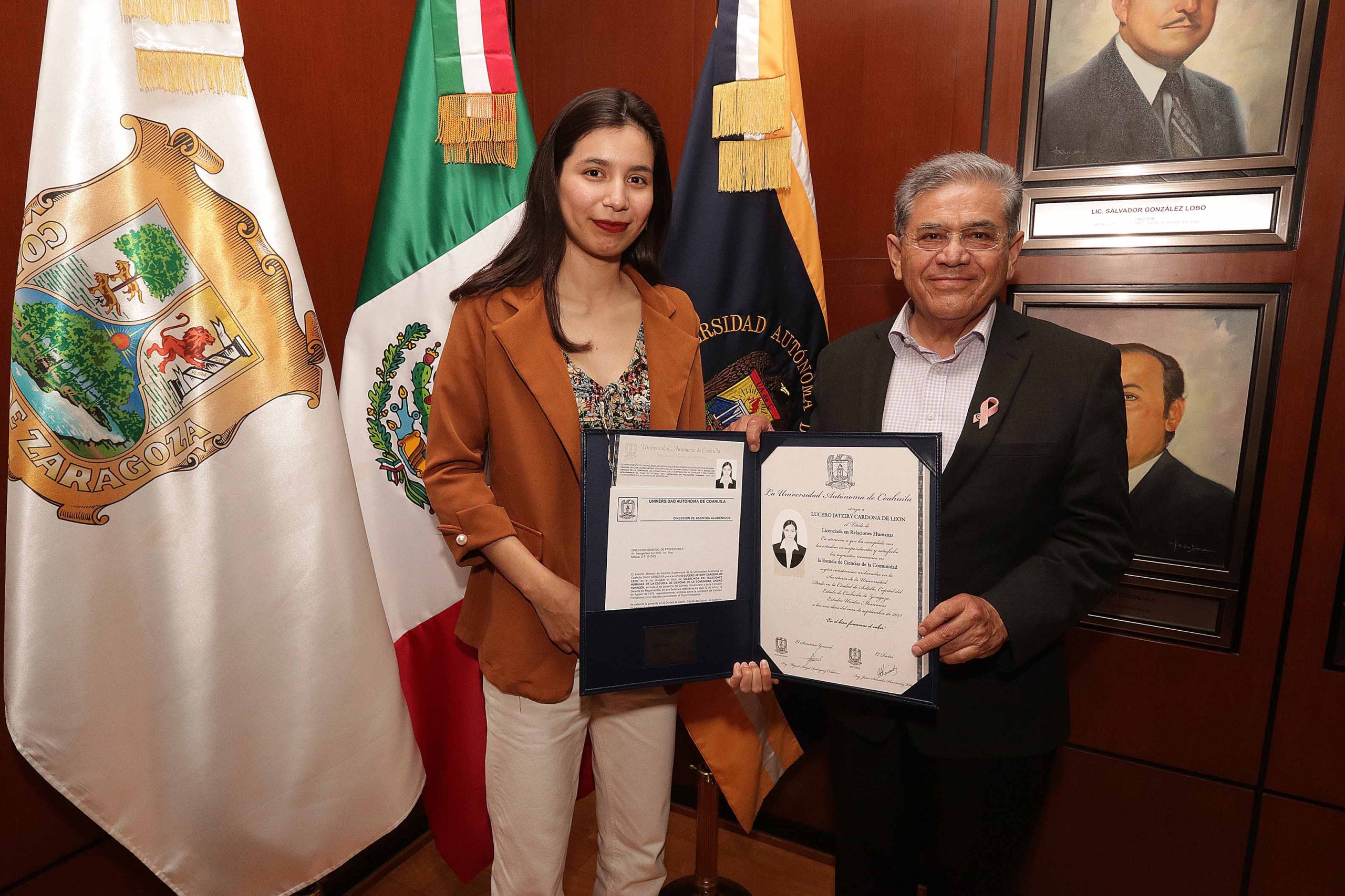 Por primera vez en la historia de la Universidad Autónoma de Coahuila, este lunes en la sala de juntas del despacho de rectoría, se entregó el título profesional en femenino a Lucero Jatziry Cardona de León como licenciada en Relaciones Humanas de la Escuela de Ciencias de la Comunidad de la Unidad Torreón.